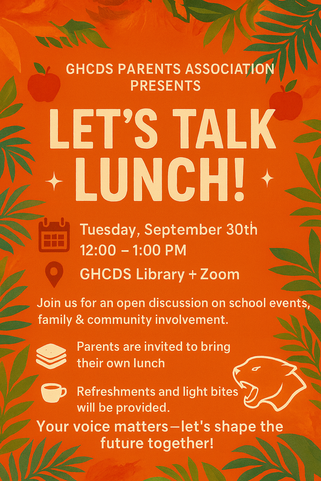 We have some important Parent Association events coming up in September and October so mark your calendars. The GHCDS Parents Association is open to all parents with no cost or time requirements. Our goal is to be inclusive of all parents and we welcome your feedback and contributions. If you feel inspired to lead an event or volunteer, please reach out by replying to this email. The Boo Bash and Campus Clean up are upcoming events where we especially will need the whole community to get involved.