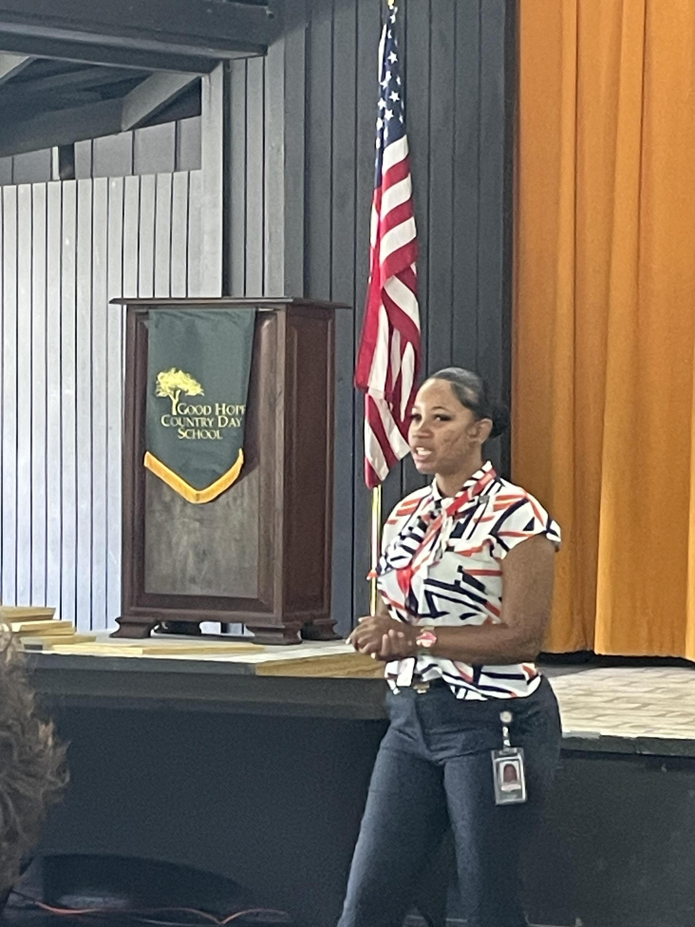 On Tuesday September 30, the Class of 2027 was privileged to have a visit from Ms. Kandyia Rivera from the Delegate to Congress, Stacey Plaskett’s office to inform them about the U.S. Military Academies. Ms. Rivera, a veteran of the U.S. Army and now the V.I. Field Representative for the Delegate’s office, spoke to the students about the 5 different academies, the nomination process for the 4 requiring a nomination (U.S. Coast Guard Academy does not) and the nomination interview. Ms. Rivera alerted the students to the opportunity for attending the academy summer programs, which give interested students a chance to experience academy life. More information about the U.S. Military Academies will be shared in the third trimester in Junior College Prep class.
