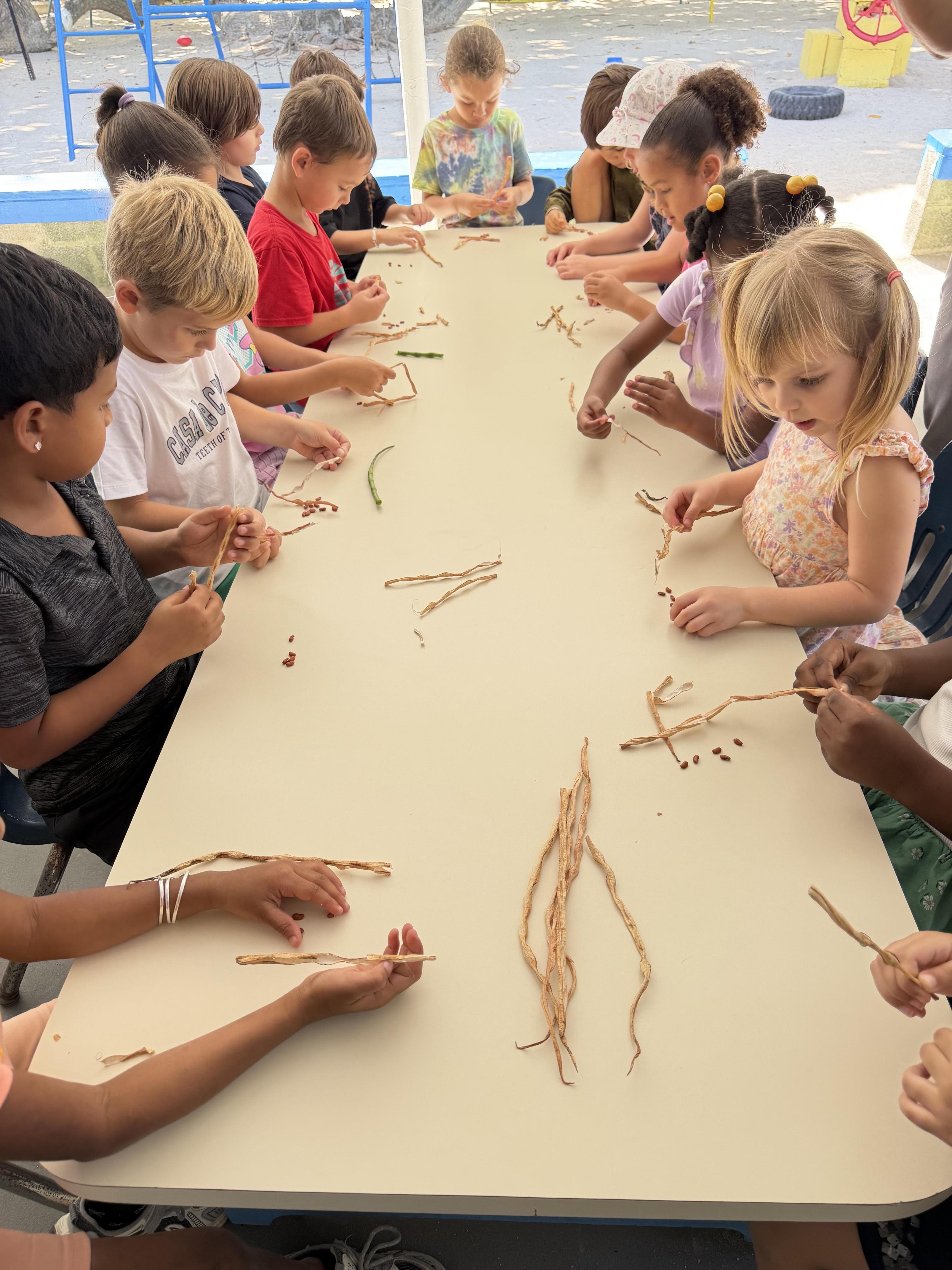 This week the student gardeners learned about the full cycle that plants go through in order to survive. We talked about a plants man goal is to ‘make babies’. After visiting the garden and noticing that there were 15 long beans that had gone brown and shriveled up, the students took them back to the lunch table to open the pods up and discover the seeds. We talked about how this was the starting point from when we first planted. Then each student donated one of their new seeds and planted it for the community garden. The rest of their seeds were given to them to take home and plant.