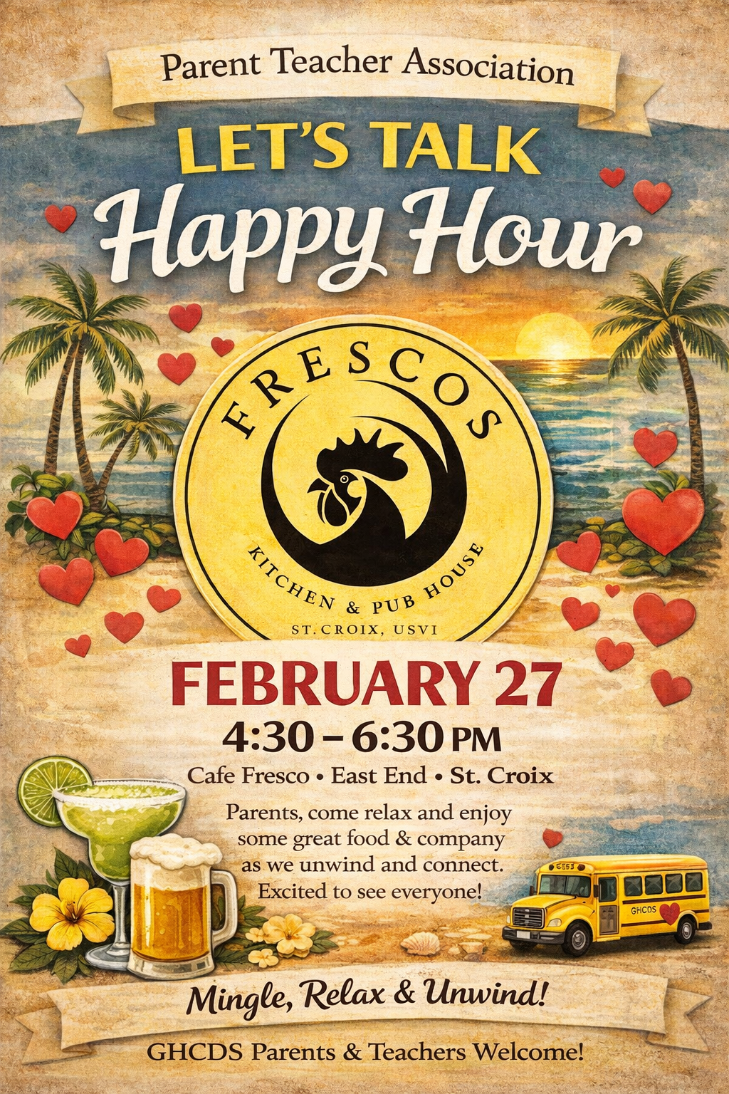 Come unwind, connect, and mingle with fellow GHCDS parents at Let's Talk Happy Hour for good company and great conversation. This is a wonderful opportunity to get to know one another, share experiences, and chat about what it means to be part of the GHCDS community. Let’s raise a glass to our amazing school and the families that make it so special!